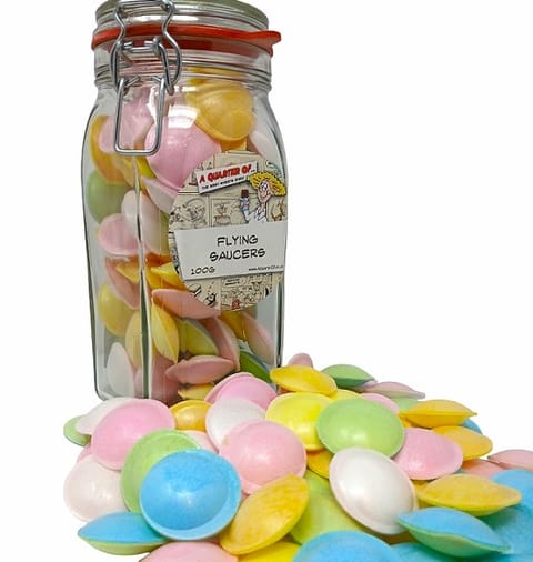 You don't want to give a gift in a soul-less polythene bag... but you will want to give one of our old-school glass kilner jars, especially when its crammed full of one of our best selling sweets - Flying Saucers.